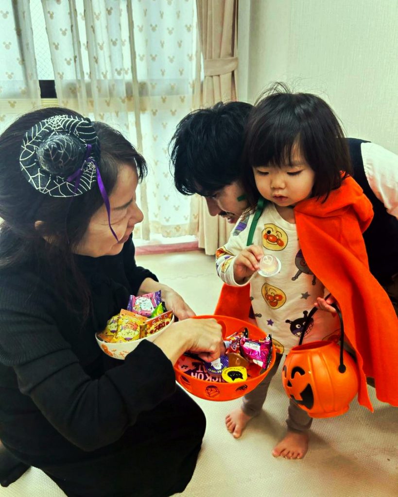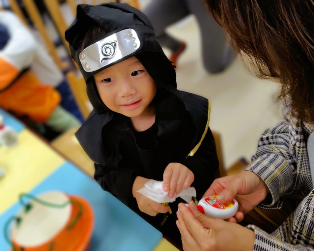 そのあと、英語の歌や絵本で楽しい時を過ごし、可愛い‟Trick or Treat!“で、お菓子入れに入りきれないくらいのお菓子をgetしました!(^^)